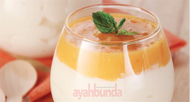 Haluskan 30 gram buah peach, 30 gram buah mangga, 30 gram jeruk manis