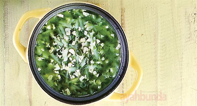 2. Tambahkan 30 gram tempe yang sudah dicincang kasar dan 50 gram daun katuk yang sudah dicincang halus.