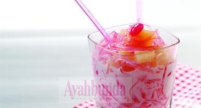 gelas saji, masukkan buah koktail dan airnya dan masukkan jeli serut.