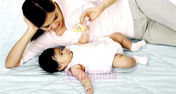 - Goyangkan rattle menjauh dari bayi agar ia berusaha mencarinya.