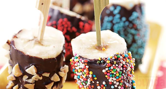 2. Celupkan pisang ke dalam cokelat leleh dan taburi dengan kacang almond cincang atau sprinkles warna-warni.