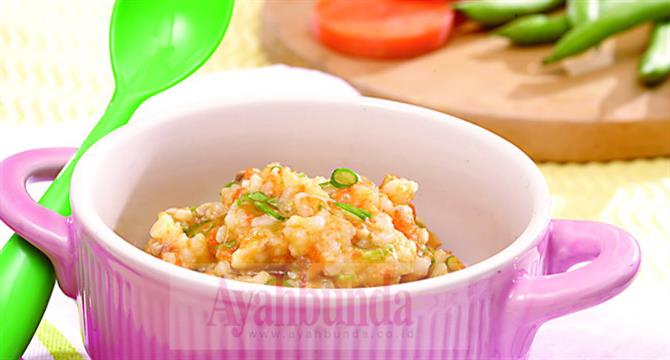 - Campur nasi aron, patin cincang, wortel, buncisi, margarin, dan kaldu dalam mangkuk tahan panas, aduk rata.