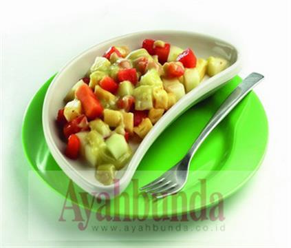 - Taruh buah dalam mangkuk, siram dengan saus. Sajikan.