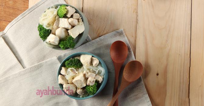 2. Masukkan brokoli, tahu, ayam, garam, gula, merica bubuk.