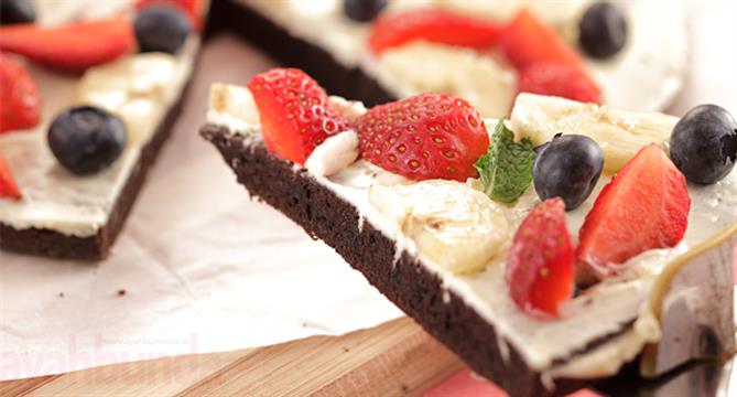 3. Campurkan cream cheese, jus lemon dan gula. Kocok lembut, tambahkan krim kental. Aduk rata. Oleskan di atas kulit pizza. Taburi dengan potongan pisang, strobery dan blueberry.