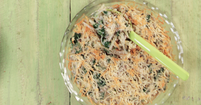 1. Campur 50 gram bayam yang dicincang halus, 200 gram kentang yang diparut kasar, 50 gram daging yang dicincang halus.