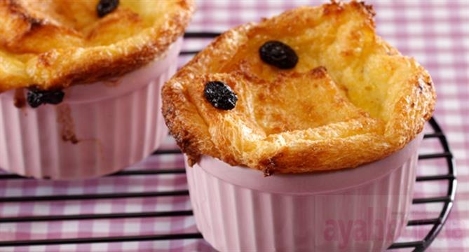 2. Letakkan 1/3 bagian potongan roti di dasar cetakan. Taburi masing-masing setengah bagian kismis, dan kayu manis. Tutup dengan 1/3 bagian potongan roti lagi. Taburi sisa kismis, dan kayu manis. Kemudian tutup dengan sisa bagian potongan roti. Sisihkan.