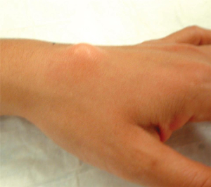 - Lokasi: selalu dekat persendian, paling sering di bagian luar pergelangan tangan. Lokasi yang paling umum berikutnya adalah pergelangan kaki dan kaki. Pada kasus yang lebih jarang, kista dapat muncul di daerah lutut.