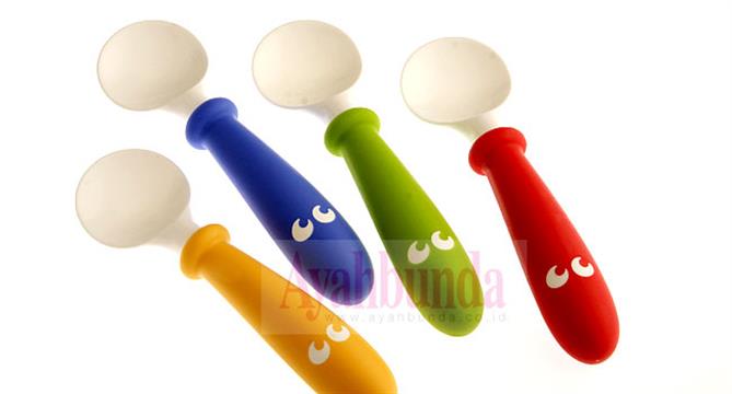 - Usia 9-12 bulan, pilih yang ujungnya agak lebar dan bergagang pendek serta tebal. Untuk dipakai anak belajar memegang sendok sendiri dan memasukkan makanan ke mulutnya.