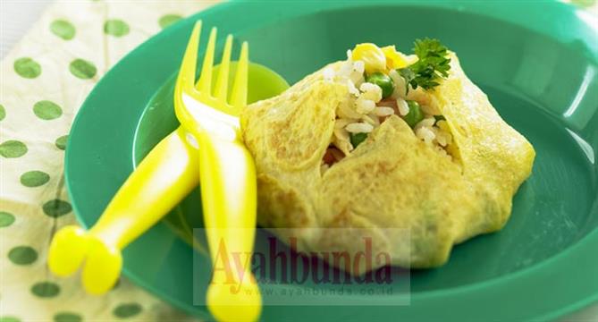 - Di selembar dadar, isi dengan nasi goreng lalu bungkus membulat. Balikkan bungkusan hingga bagian lipatan berada di bawah. Sajikan hangat.