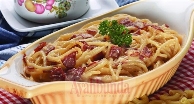2. Buat sausnya: Panaskan mentega dalam wajan kecil, masukkan daging asap, aduk hingga kecoklatan. Masukkan krim susu sedikit demi sedikit sambil diaduk rata. Masak hingga mendidih dengan api kecil selama 2 menit. Angkat. Lalu masukkan kuning telur dan keju, lalu aduk kembali.