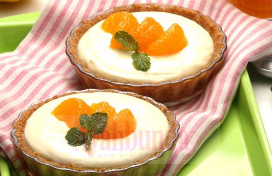 - Keluarkan mangkuk-mangkuk biskuit dari kulkas, tuangkan adonan isi ke dalam tiap mangkuk hingga penuh. Tambahkan potongan jeruk mandarin. Sajikan.