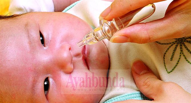 - Agar bayi bernapas lega, khususnya saat minum susu atau sebelum tidur, keluarkan cairan hidungnya dengan penguapan, menepuk-nepuk punggung bayi dalam posisi telungkup di paha Anda, atau disedot menggunakan alat penyedot lendir.