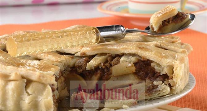 - Masukkan adonan isi 1 ke dalam mangkuk pie, selanjutnya di atasnya tuang adonan isi 2 dan ratakan. Tutup dengan potongan kulit pie bentuk saling menyilang. Panggang di oven hingga matang kecokelatan. Angkat dan sajikan hangat.