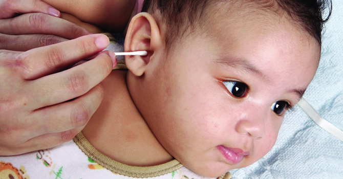 4. Jika terdapat kotoran telinga agak keras di bagian luar telinga, keluarkan perlahan-lahan dengan kapas bertangkai.