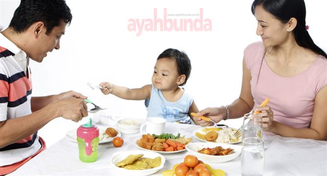 - Tunjukkan kasih sayang dengan saling melayani antaranggota keluarga seperti mengambilkan lauk, mengoper pitcher, dan saling mengucapkan terima kasih dengan cara menepuk pundak. Selain itu, suapi balita yang belum bisa makan sendiri. Tindakan itu kelihatan sepele, namun jika dilakukan dengan tulus dan gembira, balita akan merasakan kasih sayang orangtuanya.